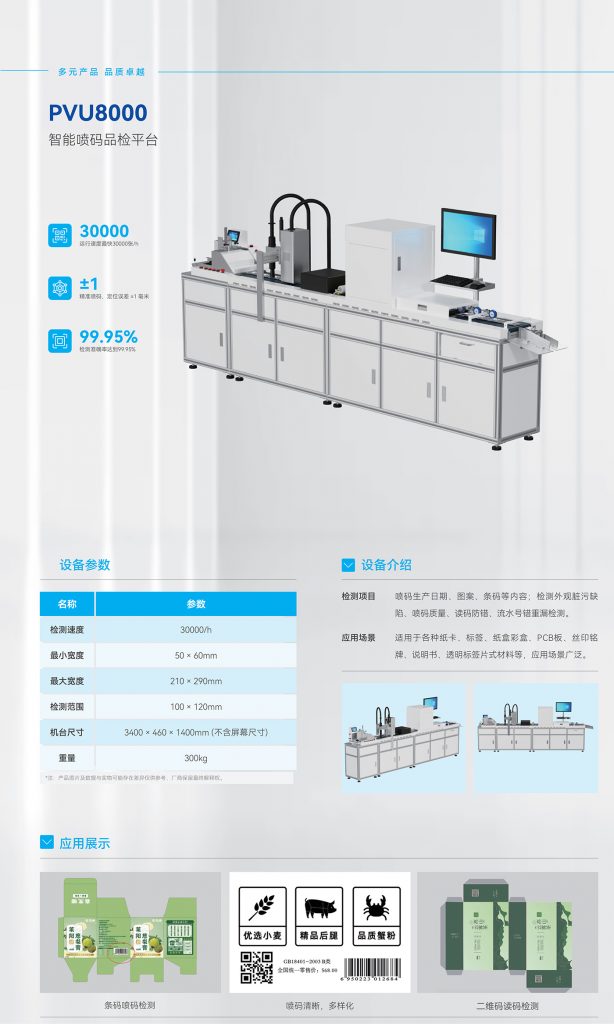 - 技術(shù)參數 PVU8000 智能?chē)姶a品檢平臺技術(shù)文檔 ?一、核心參數 ?參數項??技術(shù)指標?檢測速度30,000張/小時(shí)最小檢測尺寸50×60mm最大檢……